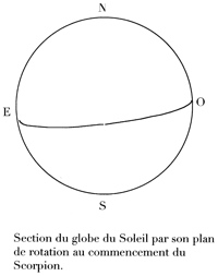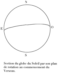 tité constante et, tout comme, dans une sphère armillaire, il n'est possible de mener, par l'axe du monde, qu'un seul plan qui soit orthogonal au plan de l'écliptique (plan, dont la section avec la sphère engendre le colure des solstices), il n'est possible de mener, par l'axe de rotation du Soleil, qu'un seul plan orthogonal à celui de l'écliptique. Ce plan est celui dans lequel on mesure l'angle de l'inclinaison de l'axe de rotation sur l'écliptique (82°, selon Scheiner). Il en résulte que, si l'axe de rotation demeure incliné, au plan de l'écliptique, non seulement d'une quantité constante, mais encore vers le même côté (si, donc, on se refuse à attribuer à cet axe un mouvement de précession), ce plan doit demeurer constamment parallèle à lui même au cours d'une rotation du Soleil sur lui-même, l'axe de rotation conservant une direction constante dans les coordonnées écliptiques (soit, approximativement, quinzième degré des Poissons Nord / quinzieme degré de la Vierge Sud). Ce plan, que nous appelions remarquable, passe par le centre des moyens mouvements solaires pour les deux longitudes précédentes, soit, approximativement, 345° et 165°.