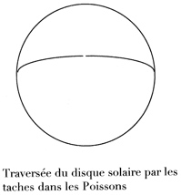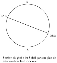 des étoiles fixes : il quale asse fisso ed immutabile si mantenga perpetuamente nella medesima inclinazione e direzione verso i medesimi punti del firmamento e dell'universo. (8). De ce fait, l'axe de l'écliptique et l'axe de rotation du Soleil définissent un plan remarquable qui demeure, constamment, parallèle à lui-même (Poissons/Vierge). Du fait de l'inclinaison du plan de rotation à l'égard du plan de l'écliptique, le plan dans lequel est vu le disque du Soleil n'est dans le plan remarquable que lorsque le Soleil est dans les Gémeaux ou dans le Sagittaire ; la trajectoire que décrivent les taches solaires, en treize jours, est alors une ligne droite, inclinée, du nord-est, vers le sud-ouest, dans les Gémeaux, ou, du sud-est, au nord-ouest, dans le Sagittaire : segnerebbe sopra la superficie des Sole la circonferenza di quel cerchio che a noi appare una linea retta. Dans les Poissons et dans la Vierge, c'est, au contraire le rayon visuel qui est dans le plan remarquable (il piano del nostro meridiano, nel qual piano sarebbe ancora l'asse della revoluzion del Sole) et la traversée des taches s'accomplit suivant un arc d'ellipse, dont la convexité regarde le nord, dans les Poissons : incurvata col suo convesso verso la parte superiore, et le sud, dans la Vierge : si mostrerà incurvata e col suo convesso verso la parte inferiore. On sait la conséquence que l'auteur en déduit : si c'est la Terre qui se meut autour du Soleil (posta la Terra immobile nel centro dell'eclittica), sarà...necessario dire che l'inclinazion di questo asse non sia fissa e riguardante di continuo verso il medesimo punto dell'universo, anzi che di momento in momento vadia mutando direzione... E' forza dunque dire, tale asse esser convertibile, e talora trovarsi nel piano del cerchio estremo terminator dell'emisferio apparente, allora, dico, quando i passaggi delle macchie appariscono fatti per linee rette e più che mai pendenti, il che accade due volte l'anno ; altre volte poi trovarsi nel piano del meridiano del riguardante, in modo tale che l'uno de' suoi poli caschi nel solare emisferio apparente e l'altro nell'occulto, ed amendue lontani da i punti estremi, o vogliam dire da i poli, d'un altro asse del Sole, il quale sia parallelo all'asse dell'eclittica (il qual secondo asse converrà necessariamente assegnare al globo del Sole), lontani, dico, tanto quanto importa l'inclinazione dell'asse della revoluzione delle macchie... Convien necessariamente porre, l'istesso asse della revoluzione mestrua delle macchie avere una sua propria conversione, per la quale i suoi poli descrivano due cerchi intorno a i poli d'un altro asse, il quale per cio conviene (come ho detto) assegnare al Sole, il semidiametro de i quali cerchi risponda alla quantità dell'inclinazione del medesimo asse ; ed è necessario che il tempo del suo