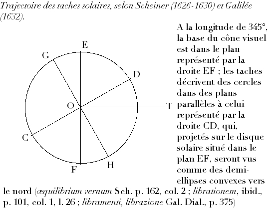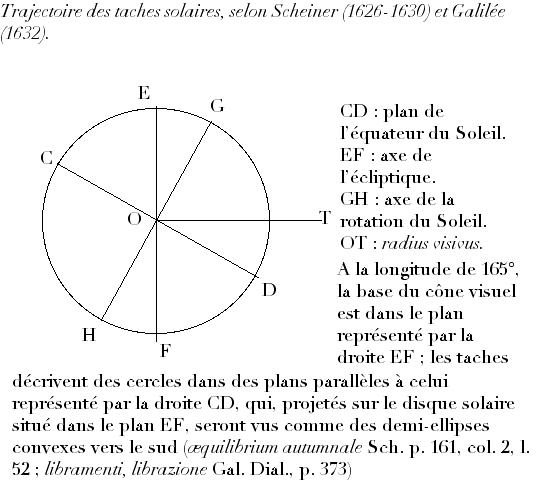 uantité, avec une période appropriée. Celle-ci s’obtient en multipliant par deux le temps mis par les taches à parcourir l'espace qui sépare le bord oriental du bord occidental du disque solaire, soit 2 x 13,5 = 27 jours ; la quantité de l’inclinaison du plan de rotation au plan de révolution est donnée par l’angle des trajectoires des taches à l’égard de l’écliptique dans les rectifications, soit, selon Scheiner, sept degrés et demi. La théorie se trouve facilitée, dans le cas du Soleil par la circonstance de la discordance des périodes des deux mouvements, de révolution et de rotation, de 365, 25 j., dans le cas de la révolution, et de 27 j., dans le cas de la rotation ; de ce fait, le mouvement des taches saute aux yeux avec une évidence qui fait d’emblée conclure à une rotation du globe sur lui-même. Les rectifications et incurvations des trajectoires des taches, les stationes et les aequilibria, renvoient, de leur côté, au mouvement de révolution, comme prouve l’usage auquel les fait servir Galilée, dans la Terza Giornata, et la signification physique que leur avait reconnue Scheiner est, simplement, le signe que le seul plan qu’il est possible de mener, par l’axe de rotation du Soleil, perpendiculairement au plan de l’écliptique, conserve sa direction initiale et demeure constament parallèle à lui-même au cours d’une révolution tropique du Soleil, tout comme il est, naturellement, soumis à la précession des équinoxes et accomplit, de ce fait, une révolution complète, à l’égard de la sphère des fixes, avec la période de la révolution de la huitième sphère.