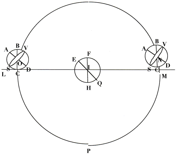 Le premier point se démontre comme suit. Lorsque la Lune sera en N, tandis que l'axe BC conservera <sa direction> à l'égard de l'axe FH de la Terre, puisque le corps de la Lune ne tourne pas sur lui-même, seront vues par les habitants de la Terre les parties <B>ASC. En revanche, lorsque la Lune se sera déplacée de N jusqu'à O, tout en conservant, pendant ce temps-là, la direction de son axe BC, alors les parties BASC, qui, lorsque la Lune se trouvait en N, étaient tournées vers la Terre, sont cachées derrière l'opacité de la Lune, cependant que se voient les parties BVDC. Seulement, une semblable apparence ne s'est présentée en aucun endroit. Il y a donc lieu de supposer que, si l'axe de la Lune conserve une direction déterminée à l'égard de l'axe de la terre, la Lune accomplit, autour de ce dernier axe, une révolution de façon à ce que, si le centre de la Lune se déplace en longitude le long du Zodiaque, elle accomplit elle-même une révolution sur son axe en formant des angles égaux en des temps égaux. / Supposons, en effet, que la Lune se trouve, à nouveau, en N et qu'on voie, toujours, ce même hémisphère <B>ASC. Une fois que la Lune sera parvenue en O et aura accompli la moitié d'un cercle, il faut que <B>ASC ait accompli, à son tour, sur l'axe, la moitié d'un cercle et soit parvenu du côté de BVD<C> pour que les mêmes côtés se tournent vers la terre. Or, que les choses se passent ainsi, on aura du mal à le croire quand on sait que la Nature procède toujours par les chemins les plus courts et ne produit jamais un effet grâce à des causes multiples, s'il peut se produire d'une manière simple. / La démonstration aboutira au même, si l'on prenait pour axe de la Lune AD, en lui supposant toujours la même inclinaison à l'égard de l'axe FH de la terre, ou en le supposant parallèle à l'axe EQ. En effet, lorsque la Lune se sera déplacée de N en O, l'axe AD aurait dû, pendant ce temps, se tourner lui aussi vers la terre et le côté ASD, rejoindre le côté AVD pour que les habitants de la terre voient le même visage de la Lune. Seulement, dans ce dernier cas, chose qui va à l'encontre de l'hypothèse, l'inclinaison de l'axe de la Lune AD, à l'égard de l'axe de la terre FH, se trouve changée, puisque, dans le cercle NOP, lorsque l'axe se trouve en O, le point A de l'axe AD a subi une révolution. Pour cette même raison, on ne saurait invoquer la mondre direction constante.» (15).