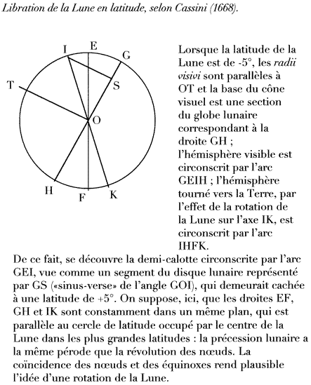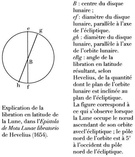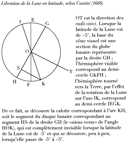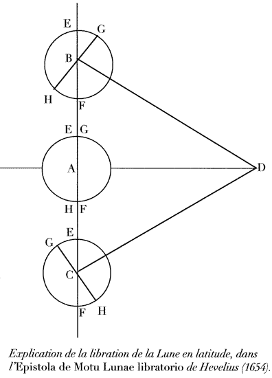 Il convient, toutefois, de faire observer que, si, dans le cas du Soleil, le système de coordonnées, indépendant de l’observateur, est celui du plan de rotation, et le système, lié à l’observateur, celui de l’écliptique, dans le cas de la Lune, le système, indépendant de l’observateur, est celui de l’écliptique, et le système, lié à l’observateur, celui de l’orbite lunaire. Le disque de la Lune fait partie du système de l’orbite, comme le disque du Soleil, du système de l’écliptique. C’est que, dans les deux cas, le cône visuel se définit dans les coordonnées du plan de révolution, celui de l’écliptique, dans le cas du Soleil, celui de l’orbite, dans le cas de la Lune. Lorsque la Lune est dans l’une de ses plus grandes latitudes, ce sont donc les pôles de l’écliptique, transposés dans le globe lunaire, qui sont, alternativement, dans l’hémisphère apparent et dans l’hémisphère caché, le pôle Nord, dans l’hémisphère caché, et le pôle Sud, dans l’hémisphère apparent, à +5°, le pôle Nord, dans l’hémisphère apparent, et le pôle Sud, dans l’hémisphère caché, à -5°. Et c'est sur ce point précis que la théorie classique de la libration, qu'on attribue, d'ordinaire, à Cassini, s'articule à celle, préclassique, de Hevelius.