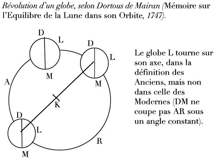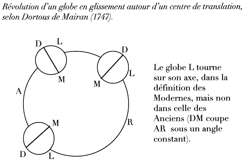 Au sein de cette configuration épistémologique instable, appelée à se modifier, à mesure que seront précisées les relations entre géométrie et mécanique, où les concepts de force, d’accélération et d’inertie commencent, à peine, de se dégager, les notions de révolution et de rotation ne sont pas, non plus, nettement distinguées. La mécanique céleste entend, aujourd’hui, par révolution, un mouvement de translation du mobile, par lequel celui-ci occupe, successivement, des points différents, sur une droite, ou sur une courbe, de translation. Mouvement de translation du mobile, la révolution est entièrement distincte, dans son concept, de la rotation, par laquelle un globe tourne sur lui-même. Sous l’effet de la mécanique céleste, nous éprouvons, aujourd’hui, de grandes difficultés à concevoir, comme les auteurs que nous commentons, la révolution d’un astre de manière à lui faire prendre en charge des phénomènes dont l’explication nous paraît revenir, naturellement, au concept de rotation.