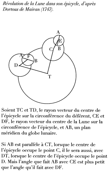 uelconque du globe lunaire rencontre, de ce fait, la droite menée, du centre du globe lunaire, au centre de son mouvement moyen, étant satisfaite par leurs observations, Hevelius et Boulliau concluent, indépendamment, que la Lune «ne tourne pas sur elle-même», entendons que son mouvement doit être pensé dans le concept d’une révolution «de glissement». D’une manière générale, une enquête plus poussée semble confirmer que les contemporains s’accordent à considérer que, dans l’hypothèse d’un excentrique lunaire sans épicycle, la Lune «ne tourne pas sur son axe» (30). Il en va autrement lorsqu’on attribue, à la Lune, un épicycle. Pour qu’un diamètre quelconque du globe lunaire conserve, dans ces nouvelles conditions, un angle constant, avec la droite menée, du centre de l’épicycle, au centre du déférent, il faudra qu’inversement, il fasse, successivement, tous les angles possibles avec la droite menée, du centre du globe lunaire, au centre de l’épicycle. En d’autres termes, pour présenter constamment le même hémisphère vers le centre du déférent, le globe lunaire devra «tourner sur lui-même», avec une période égale à celle de son mouvement en anomalie, entendu, ici, par opposition au mouvement en longitude, au sens de mouvement de l’astre dans l’épicycle, et dans le sens, direct, si l’épicycle est rétrograde, rétrograde, si l’épicycle est direct. La Lune «tournera», donc, «sur elle-même», la différence entre l’anomalie vraie, comptée au centre de la Terre, et l’anomalie moyenne, comptée au centre de l’épicycle, pouvant toujours donner lieu, le cas échéant, à une libration optique en longitude, d’une quantité égale à l’équation (31). La principale difficulté de cette dernière conception réside dans l’obligation d’attribuer, ainsi, au globe lunaire, deux révolutions, de sens contraires, mais de périodes égales. Cette condition d’une égalité des périodes de deux révolutions entièrement indépendantes l’une de l’autre, celle de la Lune, dans l’épicycle, celle du globe lunaire, sur lui-même, répugne autant à la raison que faisait, dans l’esprit de Salviati, celle du mouvement des pôles du Soleil, et de la révolution de cet astre autour de la Terre. Ainsi, un passage de Buridan, cité et traduit par Duhem, remarquable par l’analogie que présente la structure de son argumentation avec celle qu’on trouve, trois siècles plus tard, chez Boulliau, s’appuie sur cette difficulté, pour refuser l’hypothèse de l’épicycle lunaire. Dans la traduction qu'en donne l'historien, ce passage se libelle comme suit : «Il n’est, sachez le bien, qu’une seule échappatoire : elle consiste à dire que, de même que l’épicycle se meut autour de son propre c