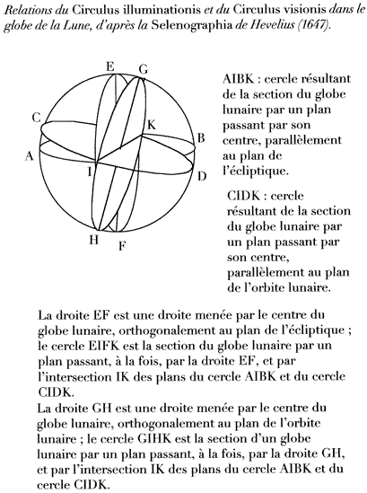 s latitudes, le plan défini par les deux droites passera aussi par la centre de la Terre (51). Par conséquent, les droites seront vues, depuis la Terre, dans la même direction et paraîtront se superposer et se confondre. D’une façon générale, l’angle sous lequel l’observateur terrestre voit se couper les deux droites varie d’un instant à l’autre sous l’effet du mouvement de la Lune autour de la Terre. Sans doute, feront-elles toujours, «physiquement», un angle de cinq degrés, mais cette inclinaison paraîtra inférieure à l’observateur terrestre pour toute latitude de la Lune différente de zéro degrés. En un sens, c’est, là, l’indice de la nature optique du phénomène, qui dépend, simplement, de l’inclinaison constante des deux plans de l’orbite lunaire et de l’écliptique, mais on peut se demander quel statut doit recevoir, dans une cosmologie comme celle de Hevelius, le plan défini par les deux droites, c’est-à-dire, au fond, par l’axe de l’orbite lunaire et par l’axe de l’écliptique, plan qui demeure constamment parallèle à lui-même au cours d’une révolution draconitique de la Lune. Puisque son mouvement apparent a pour effet de varier l’extension de l’hémisphère éclairé de la Lune, on doit supposer que, dans l’esprit de Hevelius, il coupe toujours la surface du globe lunaire dans les mêmes points, autrement dit, qu’il passe toujours par les mêmes points, matérialisés par des taches ou autres accidents, du sol lunaire, mais on ne voit plus comment, dans ces conditions, la Lune peut encore, en l’absence de nouvelles déterminations, présenter constamment le même hémisphère vers la Terre. Sans doute, ce dernier fait renvoie aux coordonnées optiques de la Lune, donc à un système de coordonnées dont les axes sont fournis par le plan de l’orbite lunaire et sa normale menée par le centre du globe lunaire, mais, puisqu’il passe, à la fois, par l’axe de l’orbite lunaire et par l’axe de l’écliptique, le plan qui demeure parallèle à lui-même au cours de la révolution draconitique présente précisément cette propriété remarquable d’