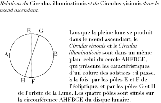 être orthogonal, à la fois, au plan de de l’écliptique et au plan l’orbite lunaire. Or, il ne peut demeurer orthogonal au plan de l’orbite qu’en accomplissant, précisément, une révolution complète, en un mois draconitique, révolution qui traduit le mouvement apparent par lequel l’axe de l’orbite décrit, tous les mois, un cône autour de l’axe de l’écliptique. De ce fait, ce plan remarquable accomplit bien, aux yeux de l’observateur terrestre, une révolution mensuelle sur l’axe de l’écliptique, que la conscience scientifique moderne pourra bien déclarer optique, mais qui n’en devrait pas moins entraîner l’hémisphère visible de la Lune dans son mouvement, ce qui n’est pas le cas.
