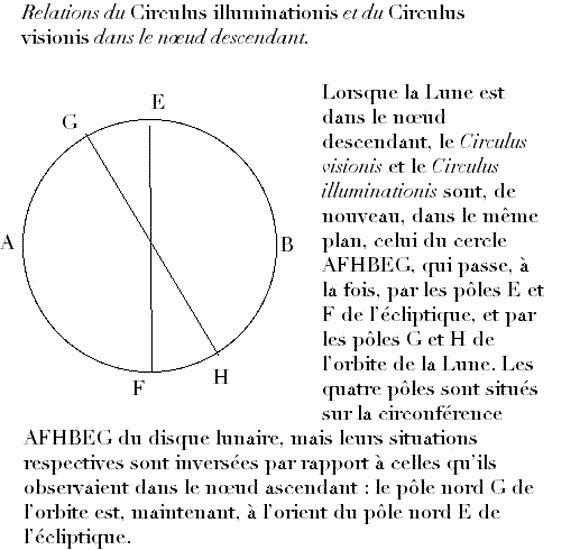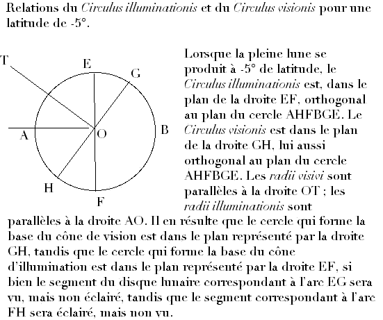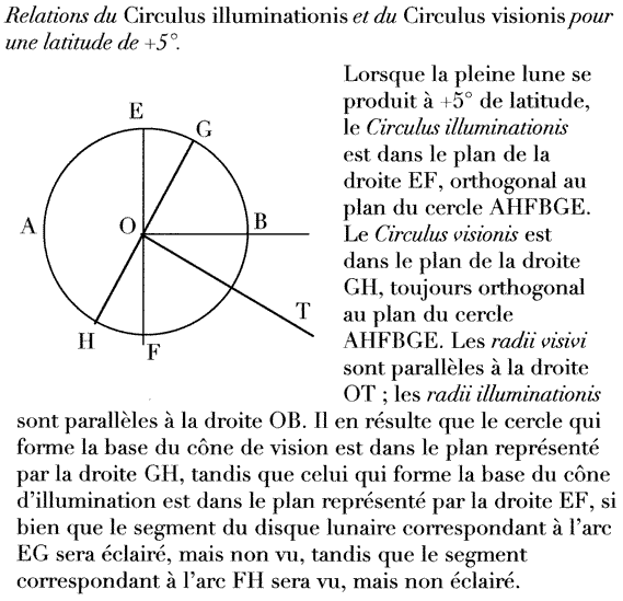 e la base du cône visuel. En revanche, l’hémisphère lunaire éclairé par le Soleil est circonscrit par une section du globe lunaire par un plan orthogonal au plan de l’écliptique (49). Or, en les assimilant à des grands cercles, passant par le centre du globe lunaire, les deux sections ne sont dans un même plan que lorsque la Lune est dans ses noeuds et elles seront décalées, l’une par rapport à l’autre, d’une certaine quantité angulaire, dès que la Lune acquiert une latitude. Dans la pleine lune, l’hémisphère éclairé varie donc selon la latitude de la Lune, cependant que, sans l’intervention de nouveaux facteurs (50), l’hémisphère apparent demeure constamment le même. De ce fait, l’indépendance réciproque de l’orbite lunaire et de l’écliptique, leur inclinaison constante et, dans les limites d’une révolution draconitique, vers le même côté, engendrent un déplacement angulaire apparent du circulus visionis, section du globe lunaire par un plan orthogonal au plan de l’orbite, à l’égard du circulus illuminationis, section du globe lunaire par un plan orthogonal au plan de l’écliptique, se traduisant, dans la pleine lune, par un passage périodique, de l’hémisphère éclairé à l’hémisphère obscur, des parties du sol lunaire voisines des pôles de la Lune et des pôles de l’écliptique lunaire.