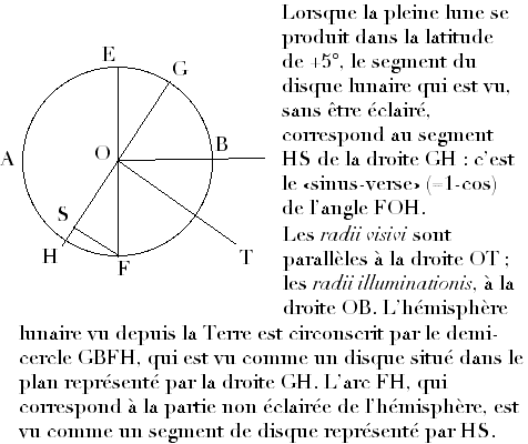 sulte que, si la pleine lune se produit dans la plus grande limite Nord, le disque lunaire présente une frange obscure, correspondant à l’arc de cinq degrés compris entre F et H, vers son bord inférieur ou méridional. A la lunette, le bord supérieur, ou septentrional, du disque offrira l’aspect lisse (laevis) du bord ocidental dans le premier quartier ou du bord oriental dans le dernier quartier ; en revanche, le bord inférieur, ou méridional, aura l’aspect irrégulier (asper) que présente, dans les quadratures, le terminateur (44). La Lune ne saurait donc être vraiment pleine qu’au voisinage des nœuds ; encore faut-il qu’elle ne s’en rapproche pas au point de provoquer une éclipse ; en revanche, lorsque la pleine lune arrive dans la plus grande latitude Nord, elle laissera une frange obscure (scabrosa) vers le Sud. L’inverse arrive dans la plus grande latitude Sud : le pôle Sud de l’écliptique, F, sera dans l’hémisphère caché ; l’aspect du bord du disque sera lisse vers H, et il présentera une frange obscure vers le bord supérieur ou septentrional (45).