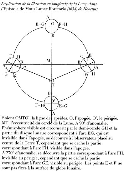 Lorsqu’en 1651, parut, à Bologne, l’Almagestum novum de Riccioli, Hevelius y trouva, formulée à l’irréel, l’hypothèse, refusée par l’auteur, suivant laquelle «la» libration vient de l’excentricité du cercle de la Lune (53). Si l’on adoptait cette hypothèse, poursuit Riccioli, il en découlerait les conséquences suivantes. «La» libration serait nulle dans les apsides ; de l’apogée au périgée, Grimaldi reculerait du bord oriental du disque, tandis que le Mare Crisium se rapprocherait du bord occidental ; inversement, du périgée à l’apogée, Grimaldi se rapprocherait du bord oriental, tandis que le Mare Crisium reculerait du bord occidental (54).