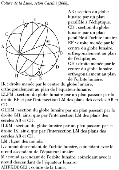 3° L’exposition, purement verbale, littéraire si l'on peut dire, dans « De l’Origine et du Progrès de l’Astronomie et de ses rapports avec la navigation. », rédigé en 1687, publié, en 1693, dans le Recueil de diverses observations faites en plusieurs voyages par ordre de sa majesté pour perfectionner l’astronomie et la géographie, avec divers Traitez astronomiques, Paris, 1693, réimprimé dans les Mémoires de Mathématique et de Physique de l’Académie royale des sciences, depuis 1666 jusqu’à 1699, tome VIII, Paris, 1730. La théorie de la libration se trouve, à la page 35, dans le premier recueil, aux pages 42-43, du second. On y lit : «Par l’un de ces mouvemens dont la révolution s’achève en 27 jours & un tiers, la Lune paroît tourner d’orient en occident sur un axe parallèle à celui de son orbite. L’autre mouvement se fait réellement d’occident en orient sur un axe dont les poles sont éloignez de ceux de l’orbite de la Lune transportés dans son globe de sept degrez & demi, & des poles de l’écliptique, de deux degrez & demi.». C’est en pensant à ce texte qu’en 1747, Dortous de Mairan écrira : «Nous examinerons bientôt ce qu’il faut entendre par le premier de ces deux mouvemens contraires, ce que je ne sache pas avoir été expliqué nulle part.» («Recherches sur l’Equilibre de la Lune dans son Orbite.», Mémoires de l’Académie royale des sciences pour l’année 1747, p. 4), ajoutant, p. 14, «Ce mouvement ne peut être que celui qui résulte, par la première définition, du parallélisme perpétuel du diamètre DM...par rapport à un point pris hors de la circulation AR ; car dans ce cas, no 14, & selon l’idée des anciens Astronomes, la circulation doit renfermer une révolution entière de la Lune sur son axe... Aussi M. Cassini qualifie-t-il cette rotation de mouvement apparent et inégal : d’apparent, parce que cette rotation n’a rien de réel que relativement à la Terre, ou à quelqu’autre point pris au dedans de sa circulation, & disparoîtroit si la Lune L ou son diamètre DM étoient vûs du Soleil ou des fixes ; d’inégal, parce que, selon l’hypothèse, il suit toutes les inégalités du mouvement de projection de la Lune dans son orbite.». Citons donc pour simple mémoire infâmante les gloses de Delambre, Montucla et autres derviches tourneurs de tables : «Le mouvement d’occident en orient, dans la partie supérieure (!), paraît se faire en sens contraire dans la partie inférieure, la seule que nous voyions... Il était inutile de parler de deux mouvements contraires ; ils sont les mêmes, comme les mouvemens de Vénus et de Mercure ressemblent à ceux de la Terre. Mercure et Vénus paraissent tourner en sens contraire dans leurs passages sur le Soleil. Il en est de même des taches que nous voyons sur la Lune. Celles que nous ne voyons pas, et qui sont dans l’hémisphère supérieur, tournent d’occident en orient comme toutes les planètes.» (Delambre (Jean-Baptiste), Histoire de l’Astronomie moderne, tome II, p. 734.). Il est facile de justifier Cassini en confrontant le texte de 1693 avec celui des Eléments d’Astronomie de Jacques Cassini, de 1740, où l’on lit, p. 259: «Pendant que les Poles du globe de la Lune font leurs révolutions de l’Occident vers l’Orient, le Colûre de la Lune sur lequel ces Poles sont placés, & qui est représenté en ligne droite lorsque cette Planète est à la distance de 90° de ses nœuds, tourne du même sens, & se transforme en une Ellipse dont la largeur augmente jusqu’à ce que la Lune étant arrivée à son Nœud, il se conforme au bord oriental de cette Planète ; & comme ce Colûre qui est fixe sur la surface de la Lune, passe toûjours par les mêmes Taches, il suit que si la Lune n’avoit aucun mouvement autour de son axe, on verroit ces Taches passer successivement du bord occidental de la Lune à son bord oriental, & revenir aux mêmes endroits après le retour de la Lune à ses Nœuds, ce qui est contraire à ce que nous observons de la Lune, dont on découvre toûjours à peu près la même face & les mêmes Taches. /Il est donc nécessaire pour expliquer cette apparence, de supposer que le globe de la Lune tourne autour de ses Poles, d’un mouvement égal & uniforme de l’Occident vers l’Orient, qui, étant vû de la Terre, paroît être de l’Orient vers l’Occident, au contraire du mouvement apparent du Colûre.» ( à confronter aussi à B. N., mss fr. nouvelles acquisitions 5.156, fol. 11 v°-12 r°.).
